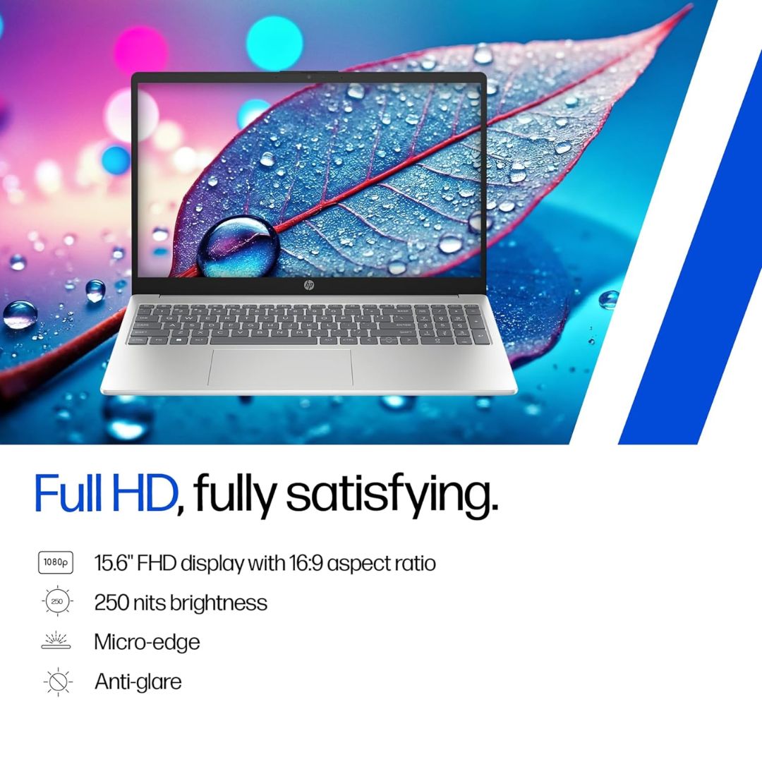 The laptop has a 15.6-inch Full HD screen. It shows clear and sharp pictures, so your eyes feel comfortable while working or watching videos. The design is slim and light, which makes it easy to carry every day.
