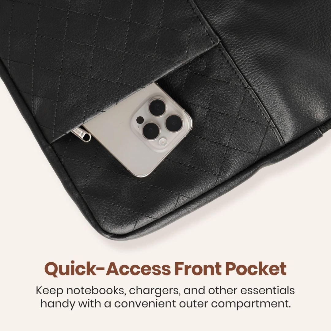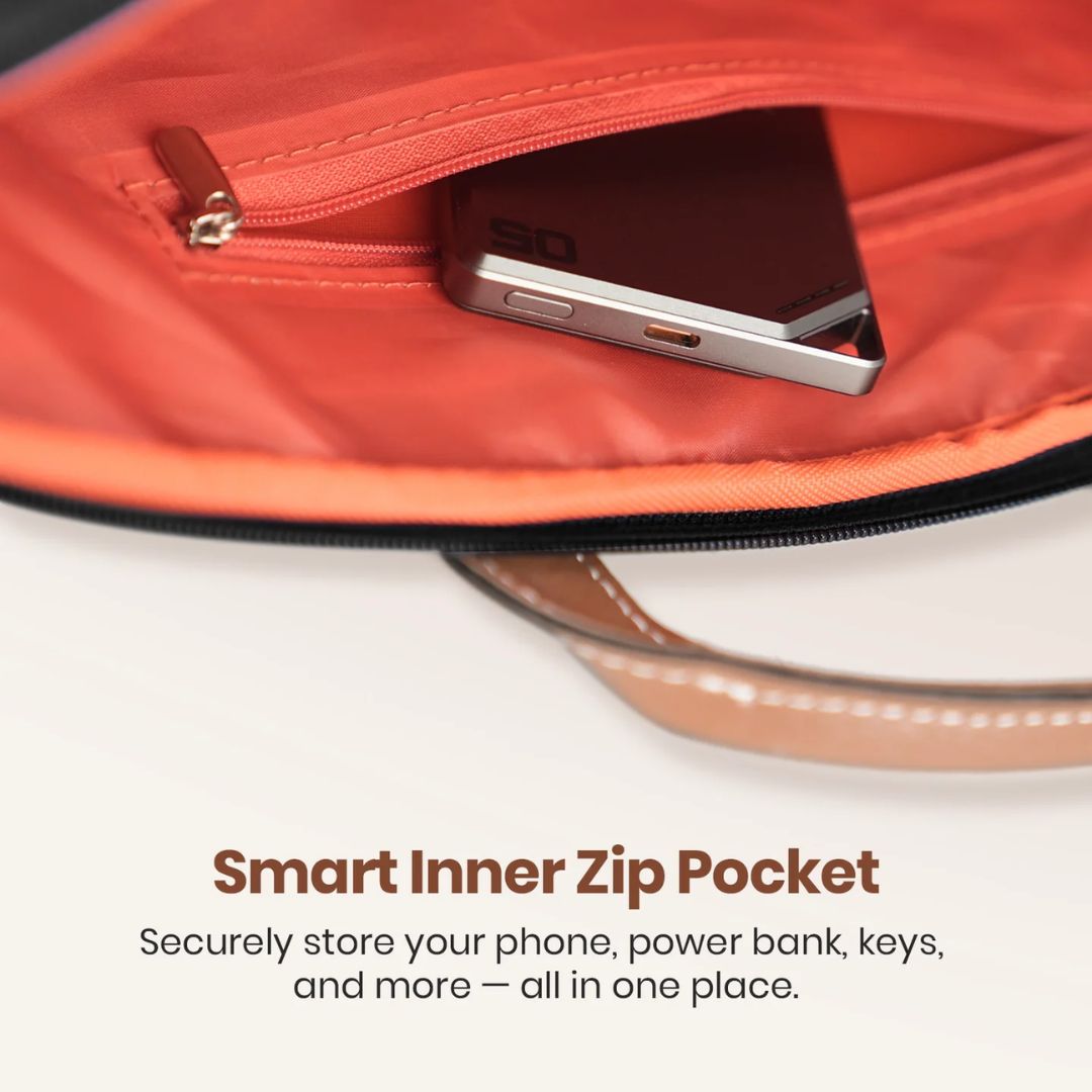 The padded laptop compartment securely fits laptops up to 15.6 inches, protecting them from daily bumps and handling. Inside, a smartly organized zip pocket helps store essentials like a phone, charger, keys, or documents. A quick-access front pocket allows easy storage of notebooks, pens, and frequently used accessories.