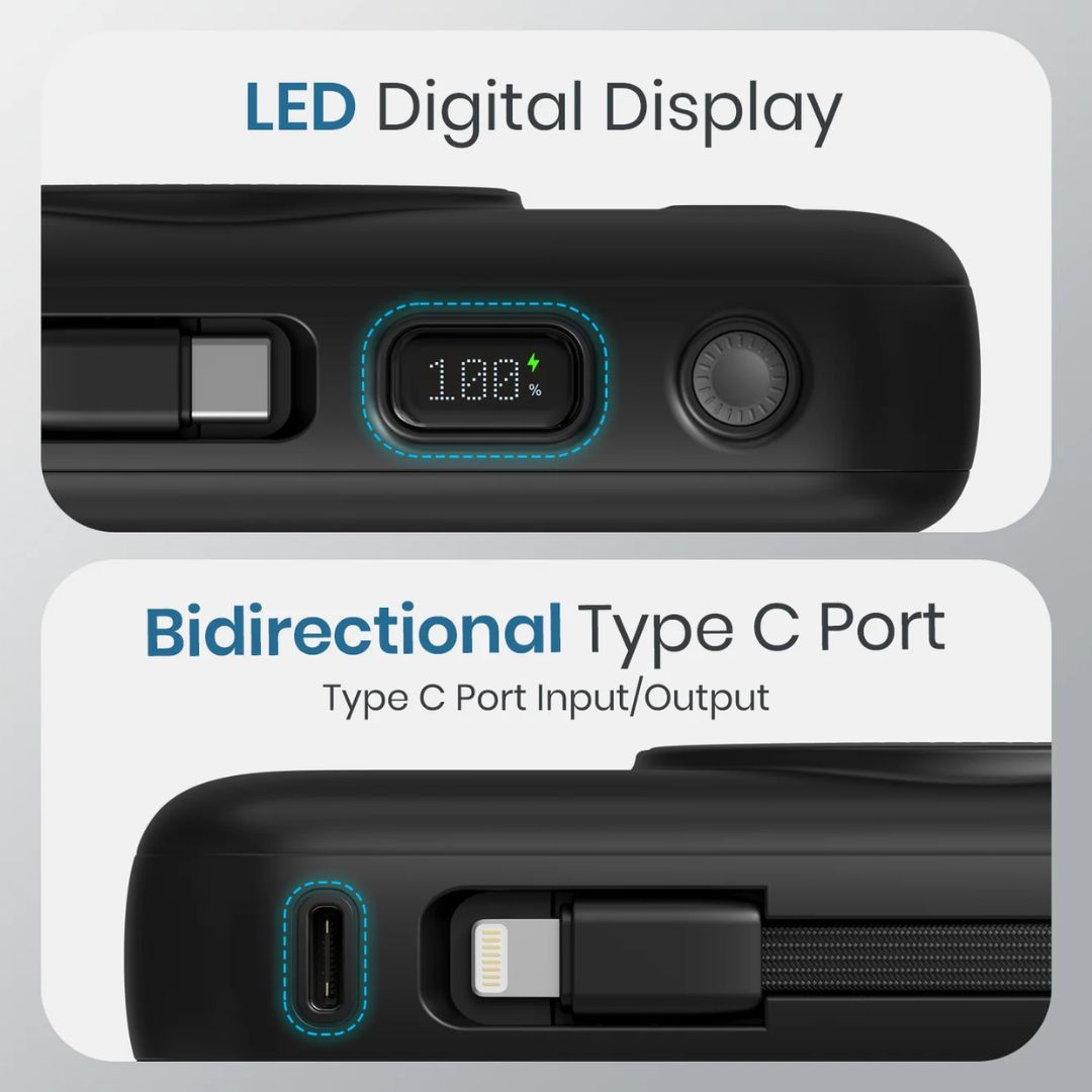 For wired charging, the power bank offers 22.5W dual output via USB and Type-C ports. It also includes a built-in Type-C cable, so you never have to worry about carrying extra wires. The magnetic wireless charging ring keeps your phone securely in place while charging.